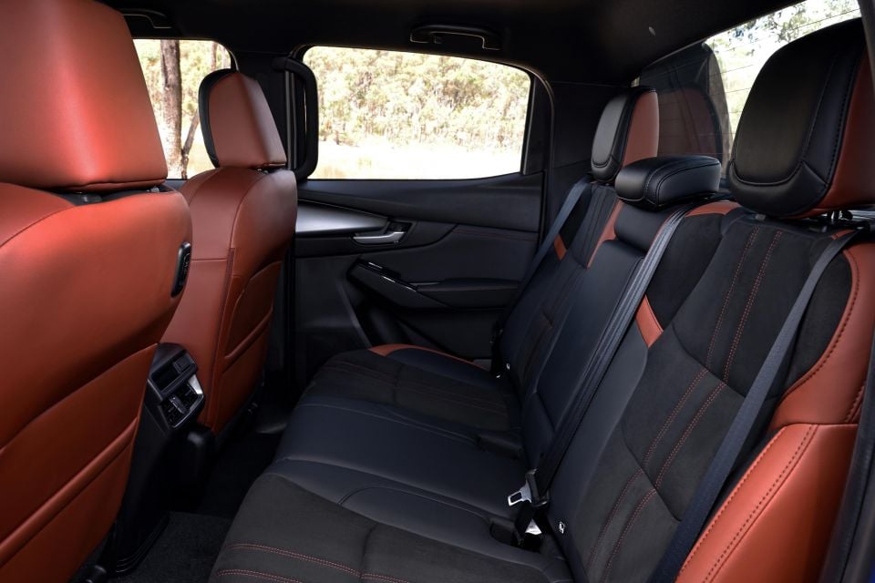 Rear amenities include dual air vents, bottle-shaped door bins, wide map pockets on the seat backs, and a centre armrest with integrated cupholders. A single USB-C outlet also features… surely there’s room for two to prevent arguments between tech-obsessed teenagers and tradies.