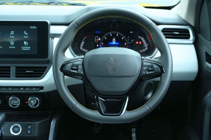 The interiors see a big change in colours and materials, and on the whole, areas that immediately catch your eye look premium and well finished. Where the earlier car had all-black interiors, the new Kiger sports a light grey colour on the lower half of the dashboard, door arm rests and the seats. Looking particularly cool was the liberal but tasteful use of yellow contrast stitching on the steering wheel, gear lever shroud, seat borders, bolsters and the arm rest. The front seat backrests also have the new Renault logo embroidered in the same yellow, which looks really neat and premium.