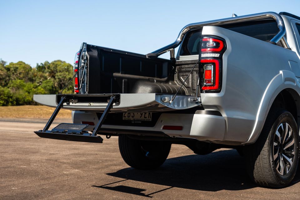 GWM also includes a handy fold-out step to make climbing into the tub easier. It extends out from the top of the tailgate and comes complete with a sprung/damped foot plate finished with abrasive material to stop wet boots sliding off.