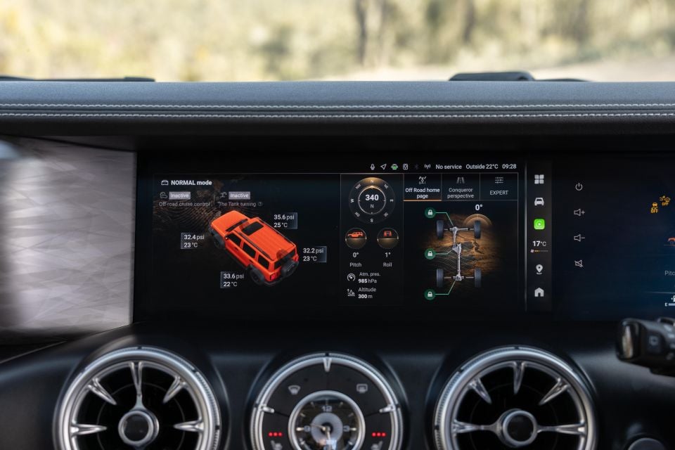You can open up a dedicated off-road set of displays which are cool to play around with. In particular, I love the ‘Conquerer Perspective’, which uses the surround-view camera and has a transparent chassis function.