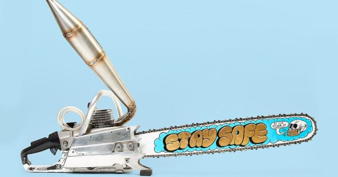 I’ve actually for a few years been drawing chainsaws in my sketchpad. I just thought they were quite a cool thing to draw. I did grow up around them in the countryside. Not sure when I thought about customizing a saw in this way; I think it just seemed like an obvious cool thing to do. Years ago, I searched online for custom-painted saws but I could only find a picture of one painted with the Hello Kitty character. More recently, I’ve searched online and found more custom-painted saws. Also, I found out years ago about the competition chainsawing world and the “hot saws.”