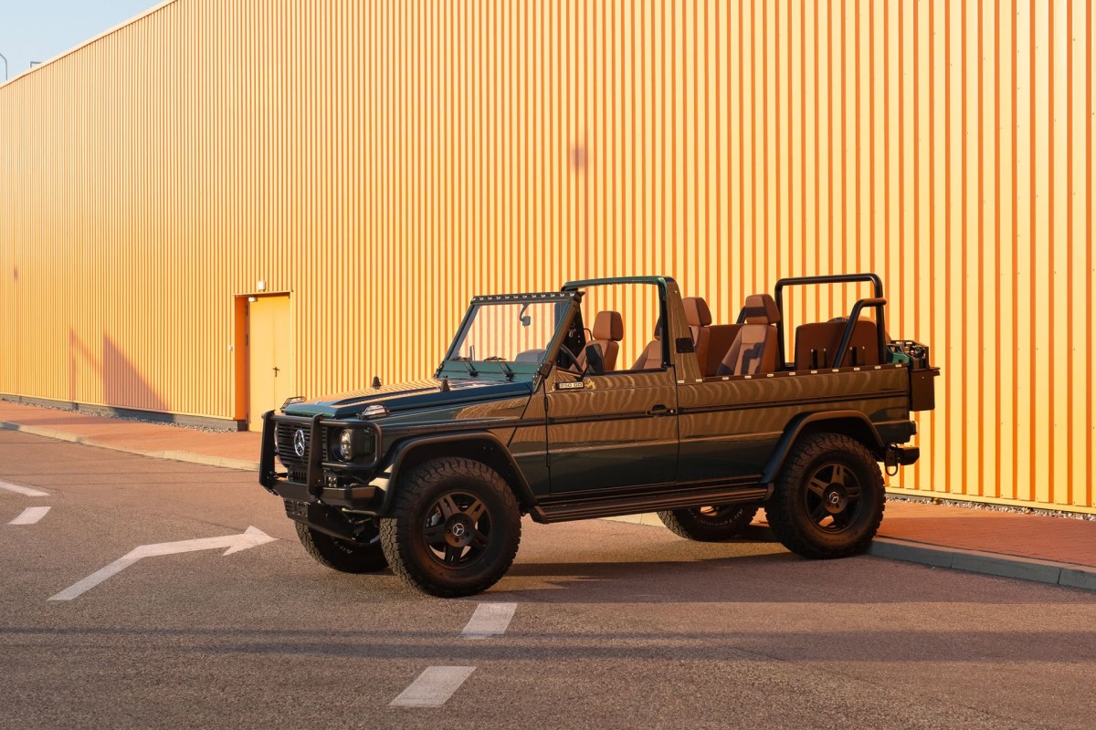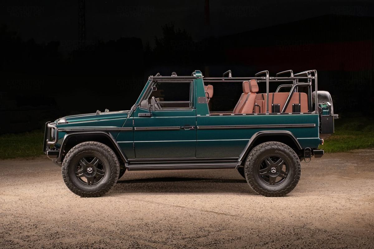 EMC has been modifying classic G-Wagens since 2017, but for the very first time, the New Jersey-based company created a long-wheelbase layout that can carry up to eight passengers. The two new sideways-facing rear seats allow four smaller passengers to enjoy the open-air experience, while a removable black top covers the sports bars when needed, and a fold-down windshield further enhances the topless feel. Outside, the stretched G-Wagen gains LED lights and is finished in EMC Racing Green with 18-inch matte black wheels, 12.5-inch all-terrain tires, side steps, and a steel bash plate retaining the original G-Wagen’s off-road capability.